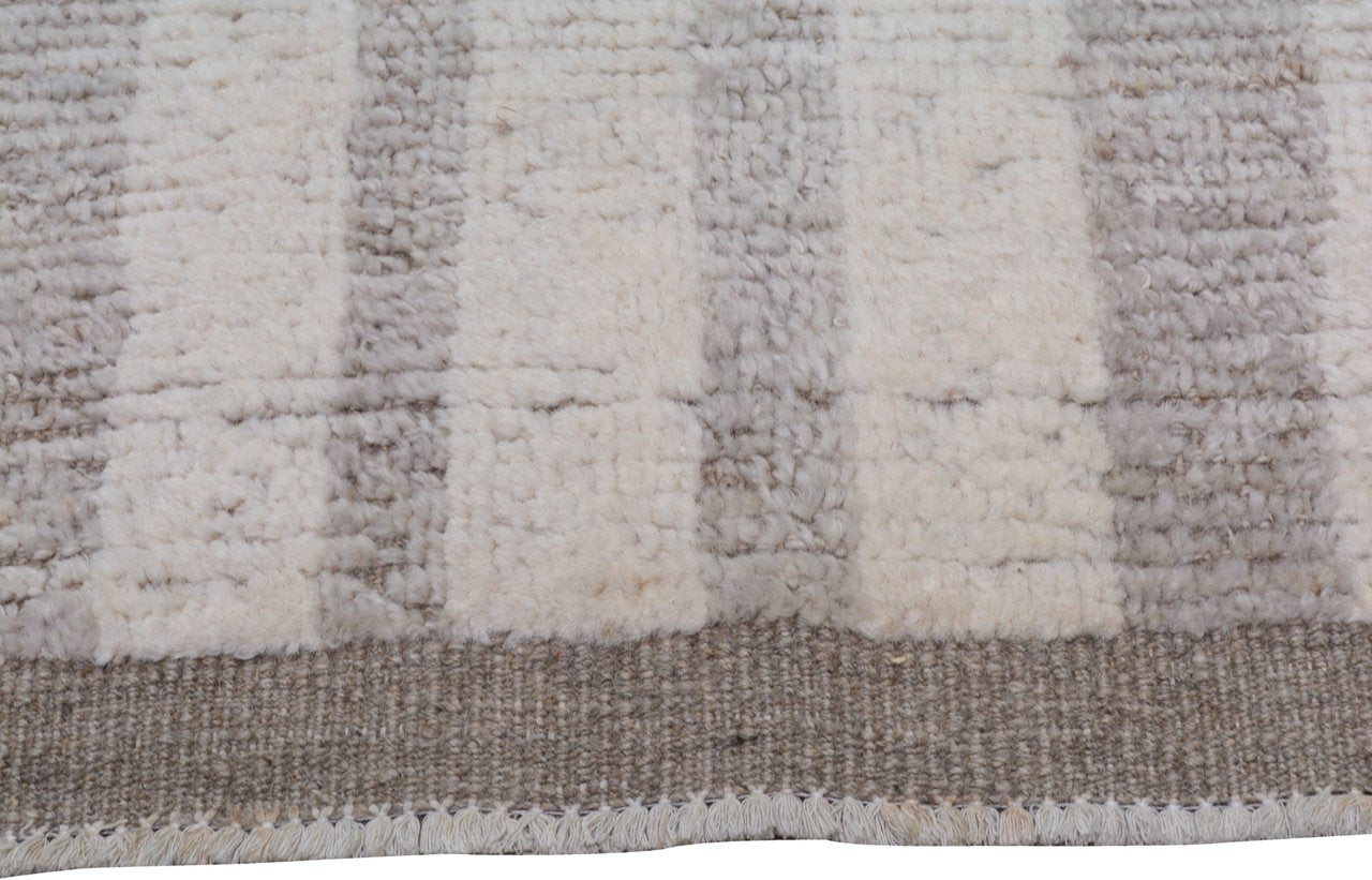 A hand-knotted Moroccan wool runner with beige lines over dark tan background. Its tactile and pale tones create a refined accent for both classic and modern interiors.