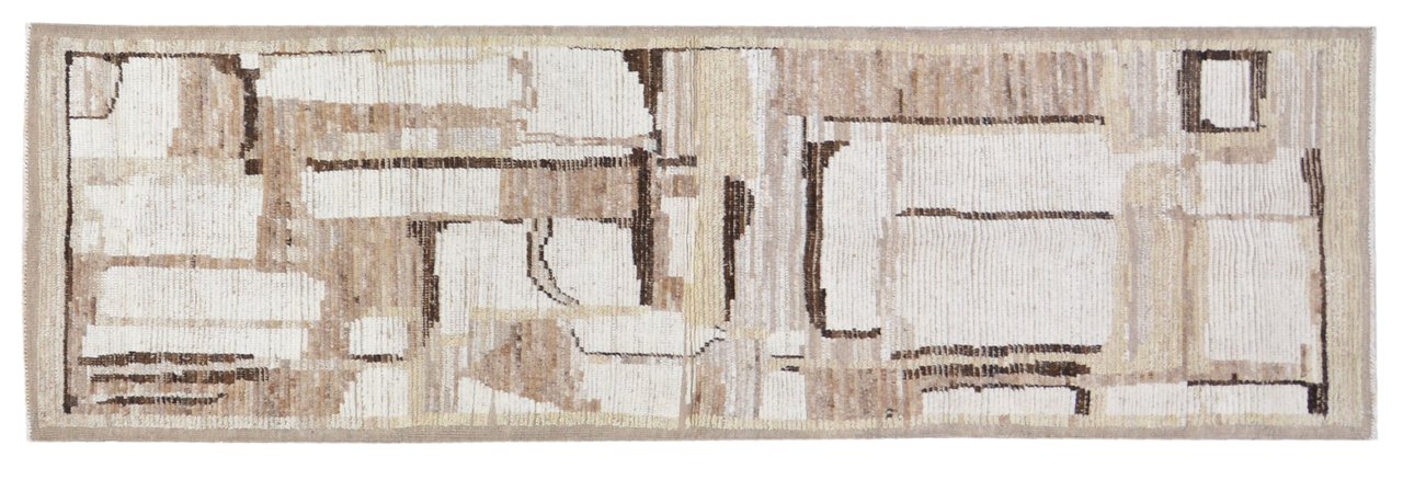 This Moroccan runner showcases abstract patterns on a warm cream and brown field. Hand-knotted in wool, it merges traditional artistry with contemporary interior appeal.