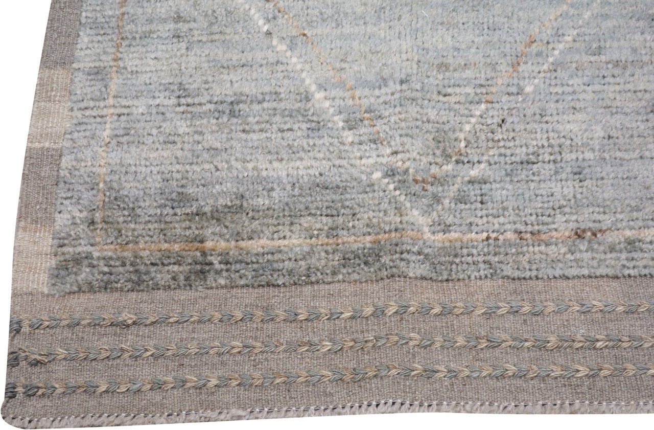 A hand-knotted Moroccan rug in greenish grey shades, accented with defined geometric lines. Its texture and craftsmanship merges traditional artistry with versatile modern interior styling.